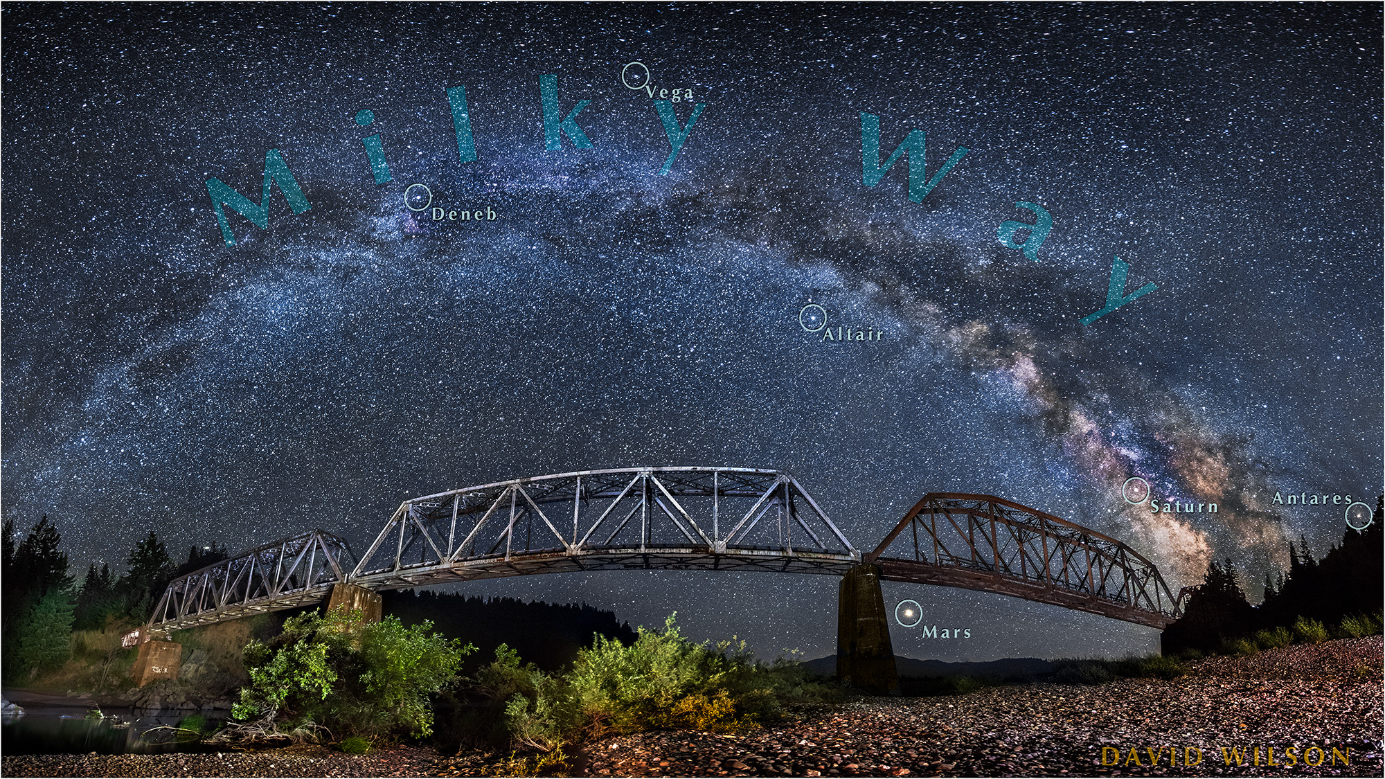 Milky Way arches over The South Fork Bridge rail road trestle on the Main Fork Eel River, with annotations for notable stars and planets.